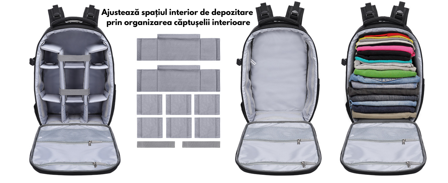 Compartimentul superior (42 x 29 x 14 cm) are insertii modulare captusite si detasabile, personalizabile pentru camere, blituri, obiective si drone. Poti organiza spatiul interior conform nevoilor tale.