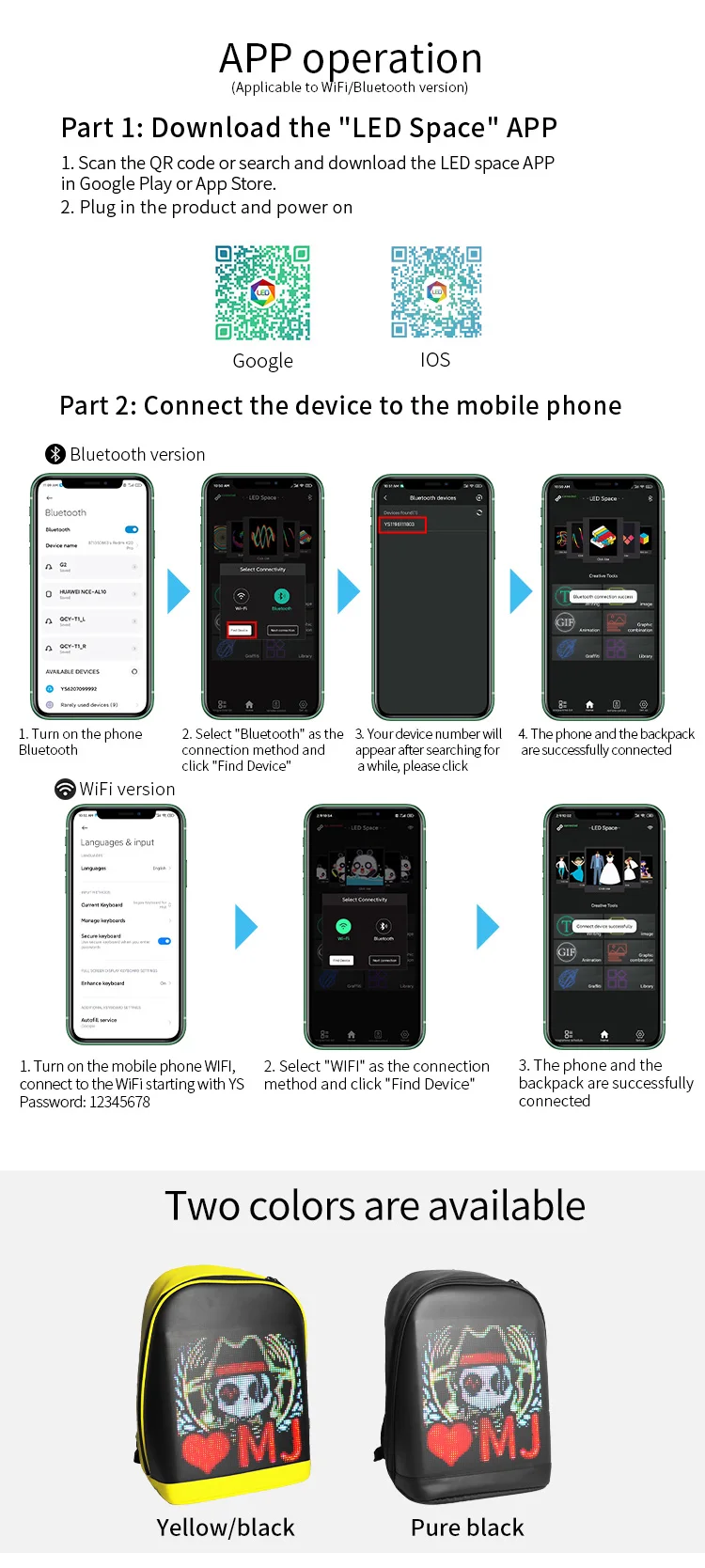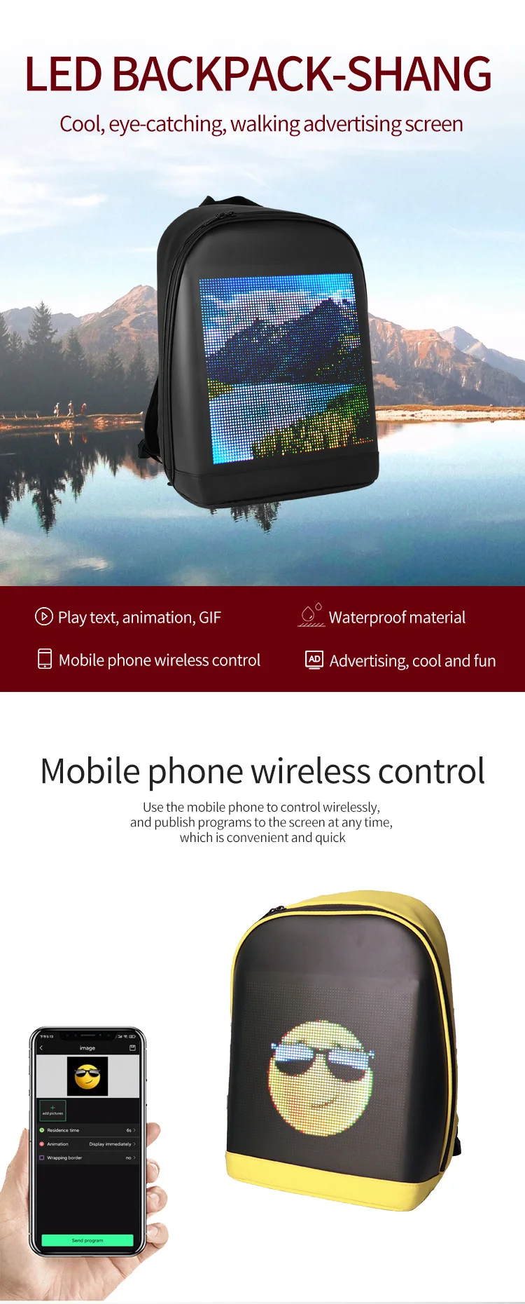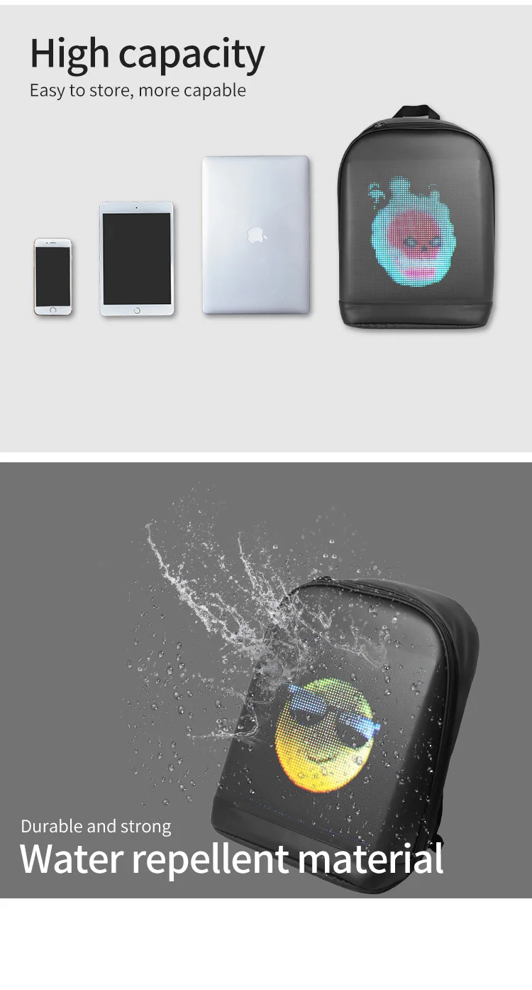 Acest rucsac smart vine cu o afisare LED care poate fi controlata prin conexiunea wireless direct din telefon sau tableta compatibil cu Android si IOS.Ecranul LED de 25x25 cm ilumineaza si face usor de vazut continutul, chiar si in conditi de lumina slaba.Rucsacul este impermeabil, astfel incat continutul va fi protejat de intemperii.