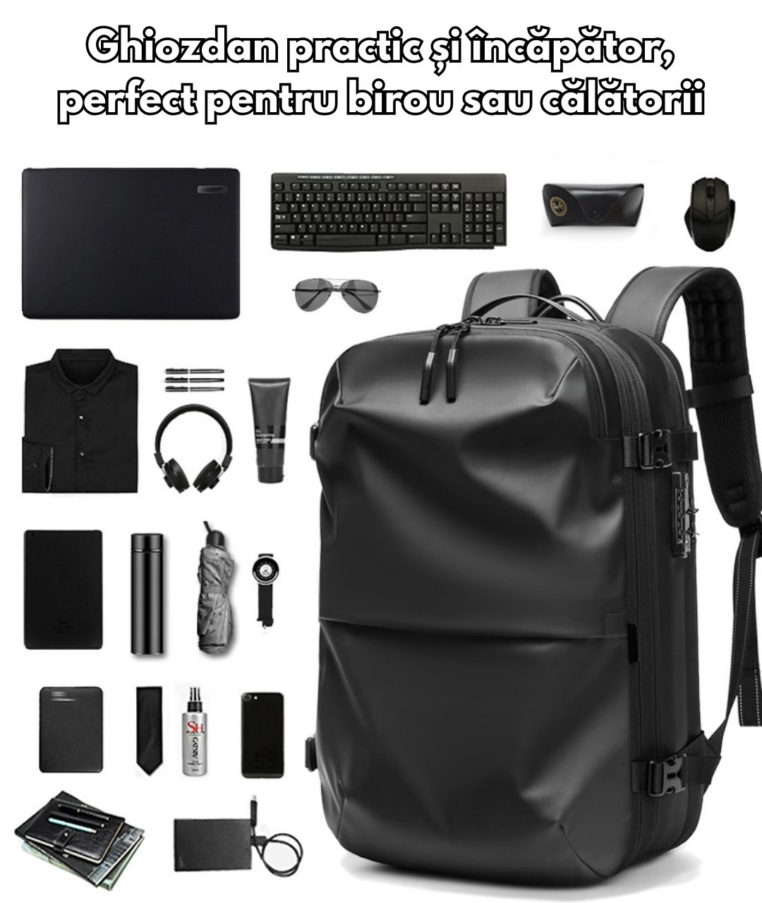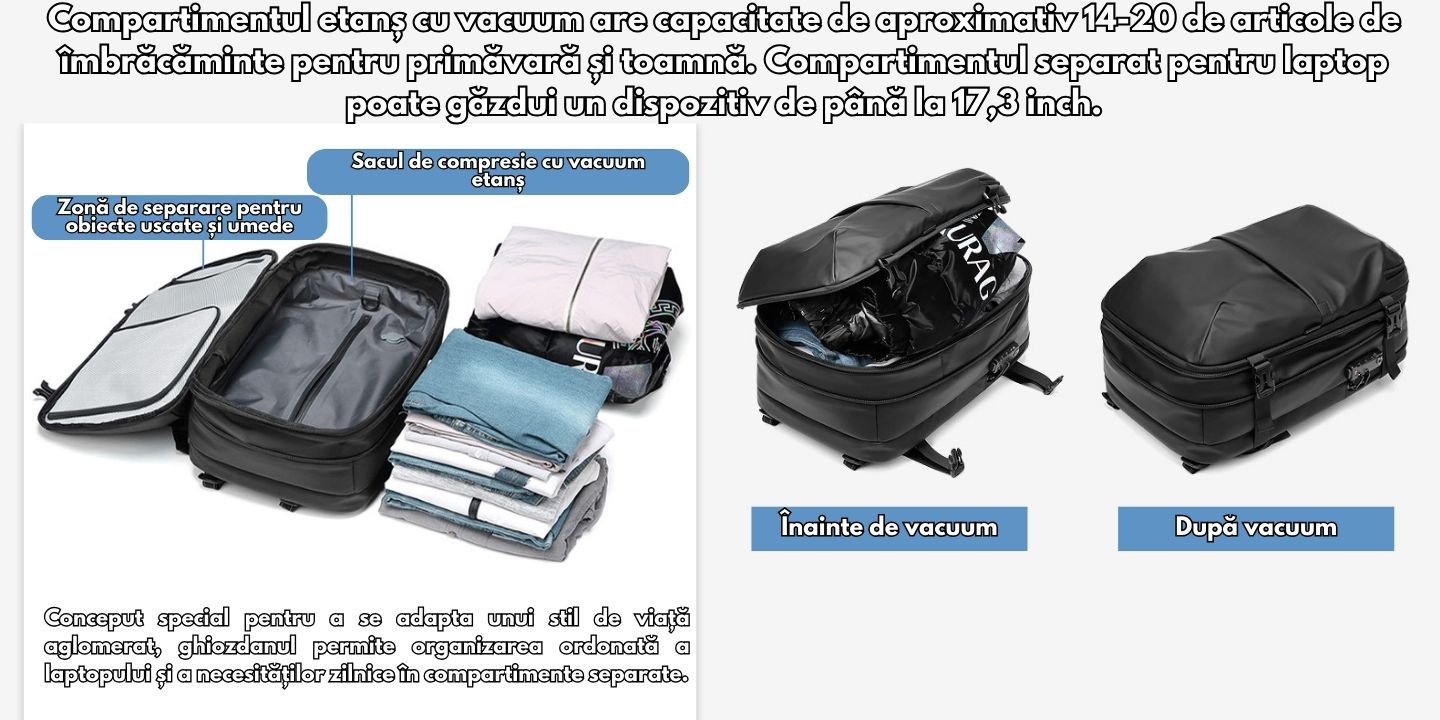 Acest rucsac inovator vine cu o functie de vacuum care iti permite sa extinzi capacitatea de la 25L la 60L, inlocuind cu succes un troller de 24 inch. Astfel, poti transporta mai multe lucruri intr-un spatiu compact, facandu-l ideal pentru calatorii lungi sau vacante. Te vei bucura de mai mult spatiu fara a compromite mobilitatea.