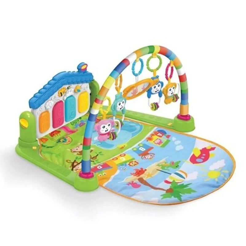 Saltea cu 5 activitati pentru bebelusi, Prevazuta cu jucarii zornaitoare, Cu pian, 12 cantece si sunete si 4 povesti, Functionare cu baterii 3 x AAA (neincluse),84x44x64cm, Multicolor