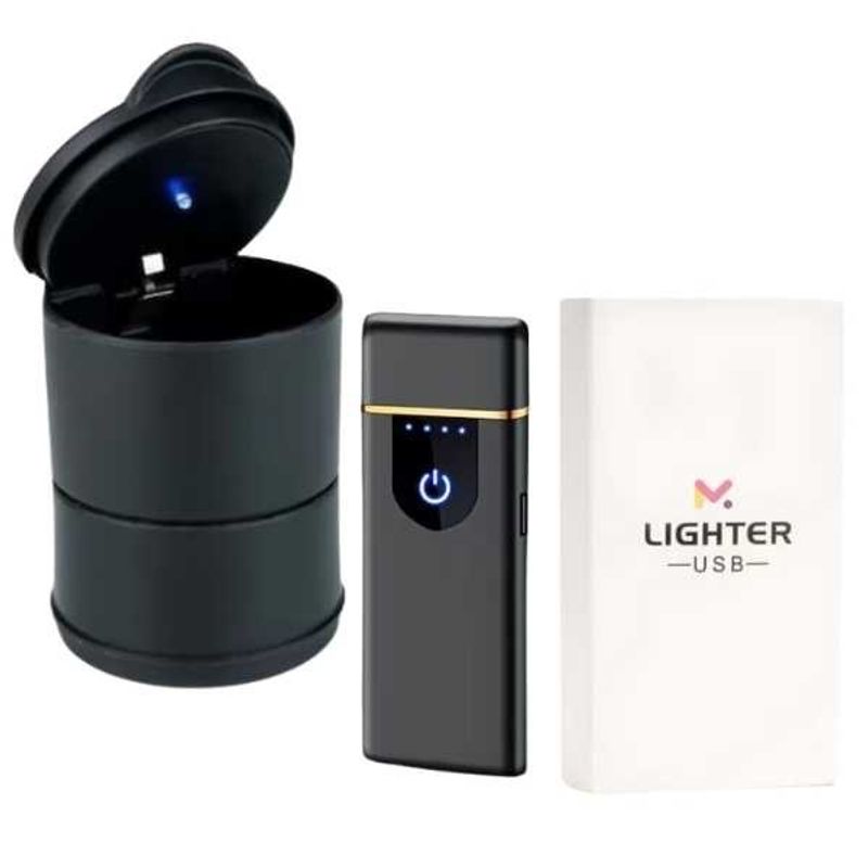 Acest set include o scrumiera auto rotunda cu iluminare LED si o bricheta neagra electrica antivant, ambele produse fiind perfecte pentru cei care doresc functionalitate si eleganta.