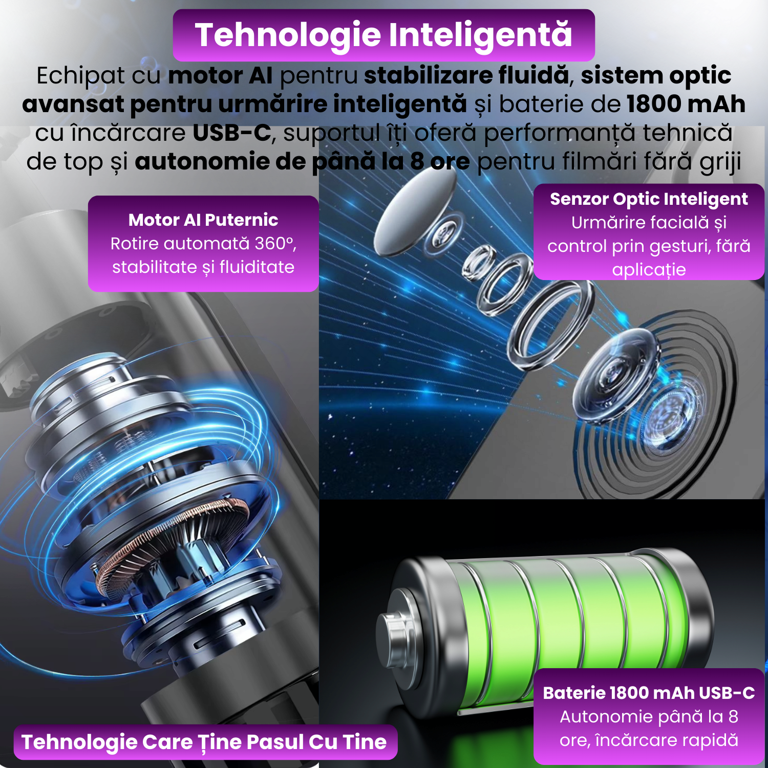 Pentru ca este mai mult decat un selfie stick. Este un asistent inteligent care te urmareste, te lumineaza, te stabilizeaza si iti ofera control total asupra fiecarui cadru. Totul, fara aplicatii, fara fire si fara batai de cap.