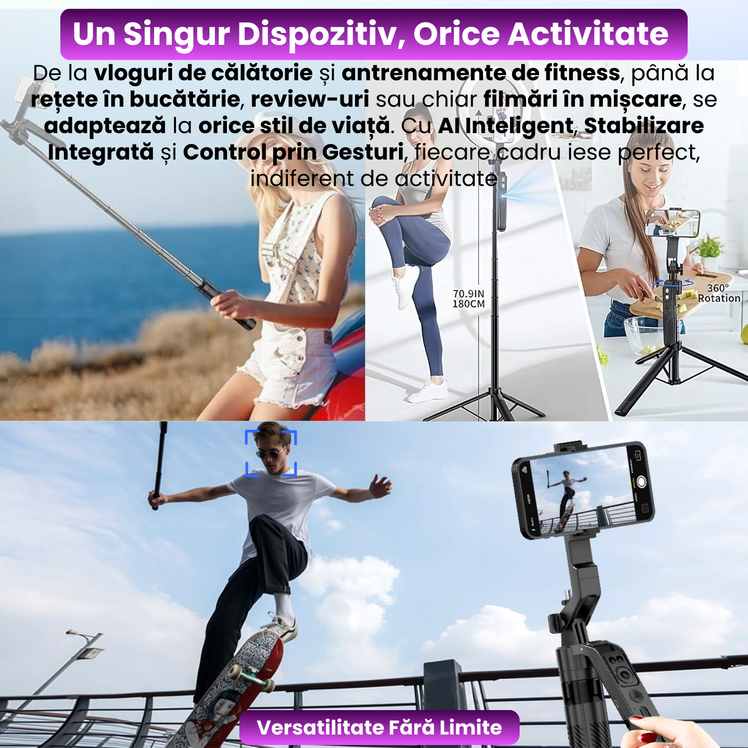 - Ax filmari laterale (270°), perfect pentru side shots, cadre creative sau vloguri freestyle