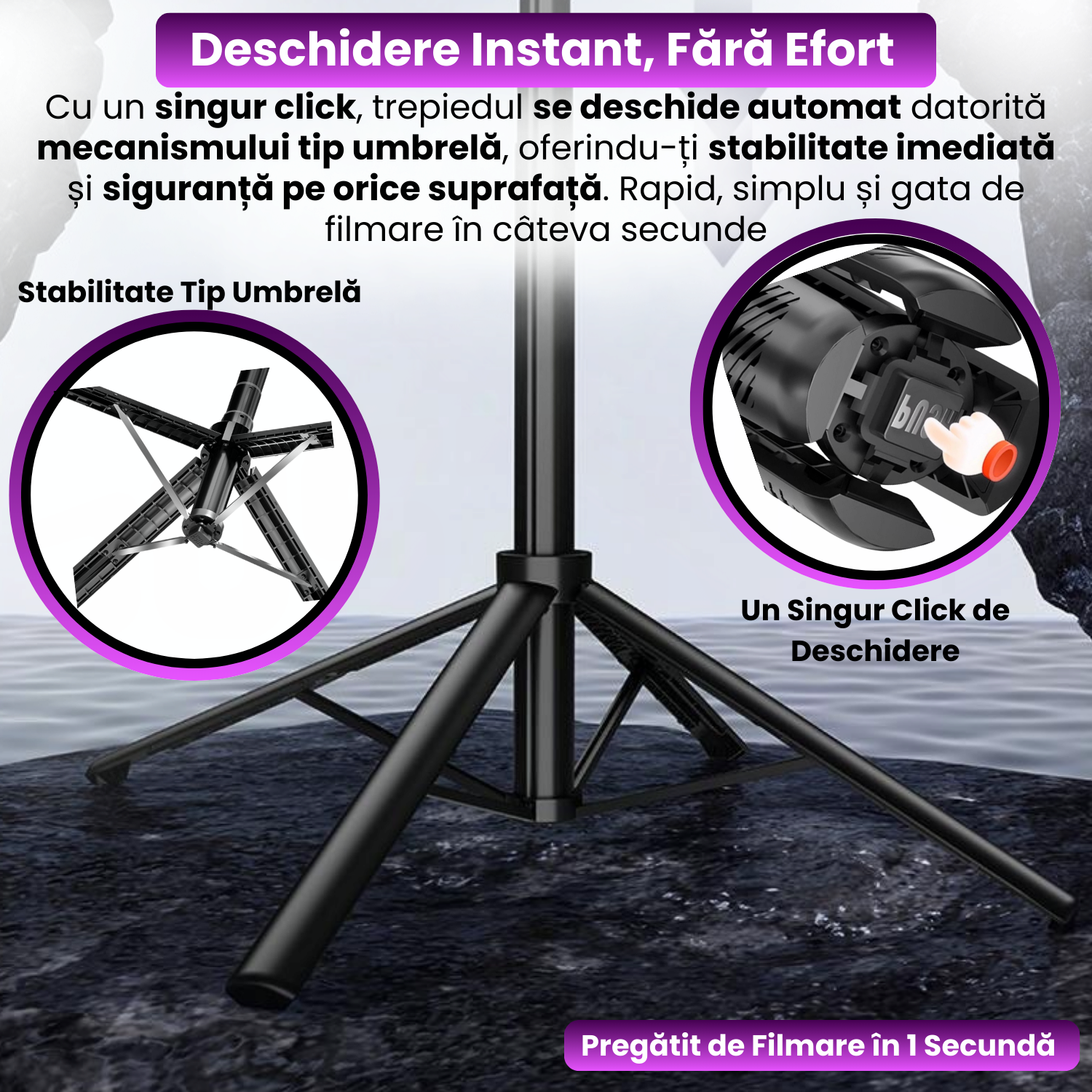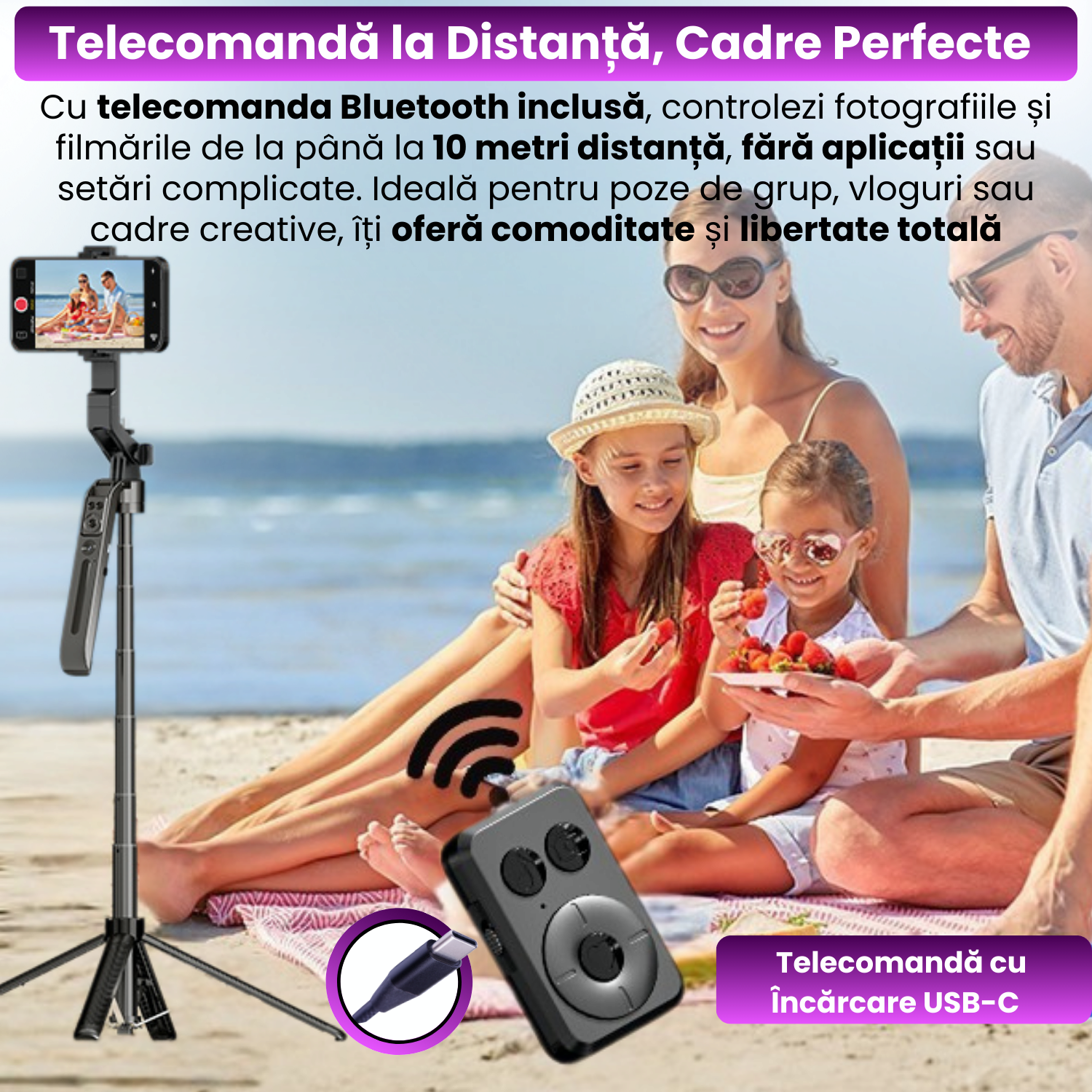 Compatibilitate: telefoane iOS/Android (4”–7”), GoPro, camere de actiune, accesorii 1/4”