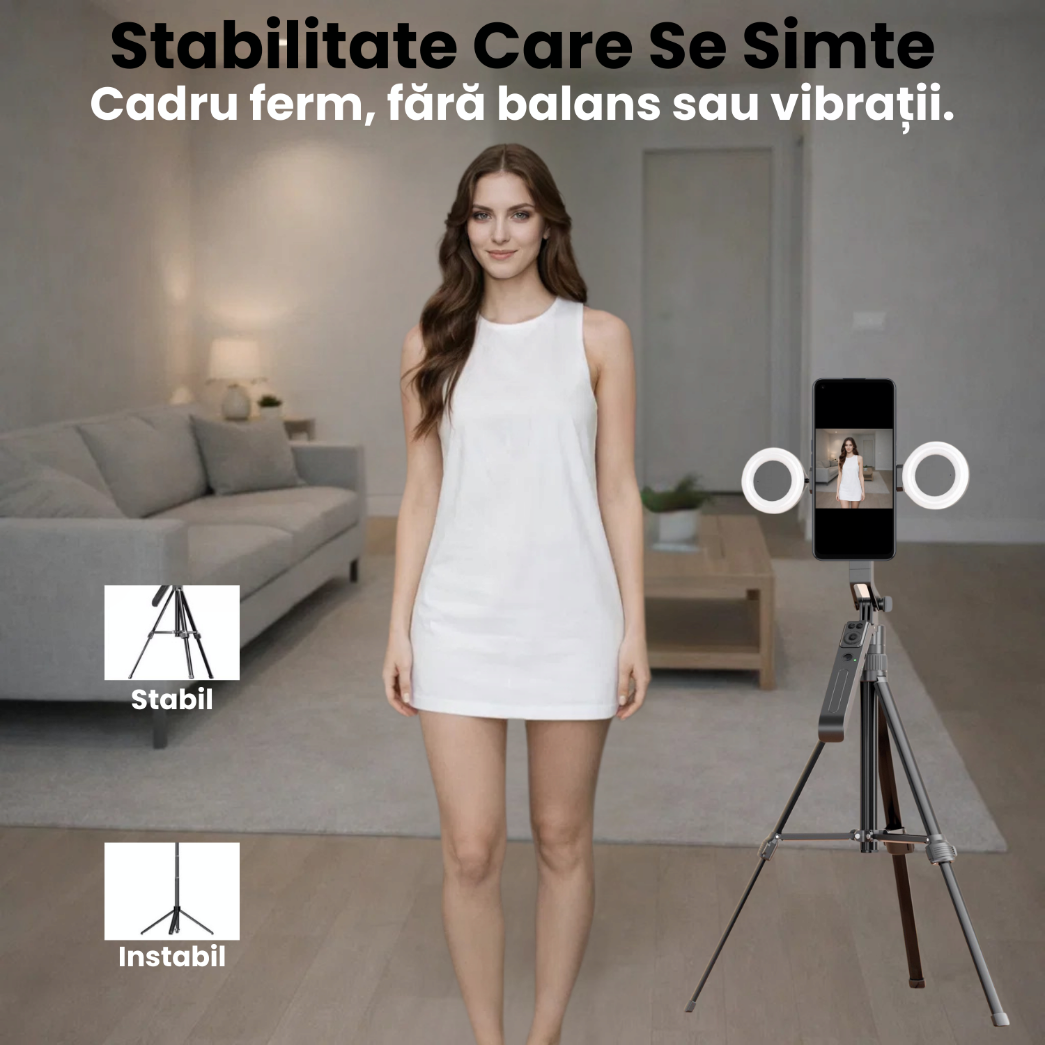 Aceasta constructie reduce semnificativ vibratiile si balansul, oferind siguranta reala pentru dispozitivele tale si cadre constante, inclusiv in filmari mai lungi sau atunci cand te misti in fata camerei.