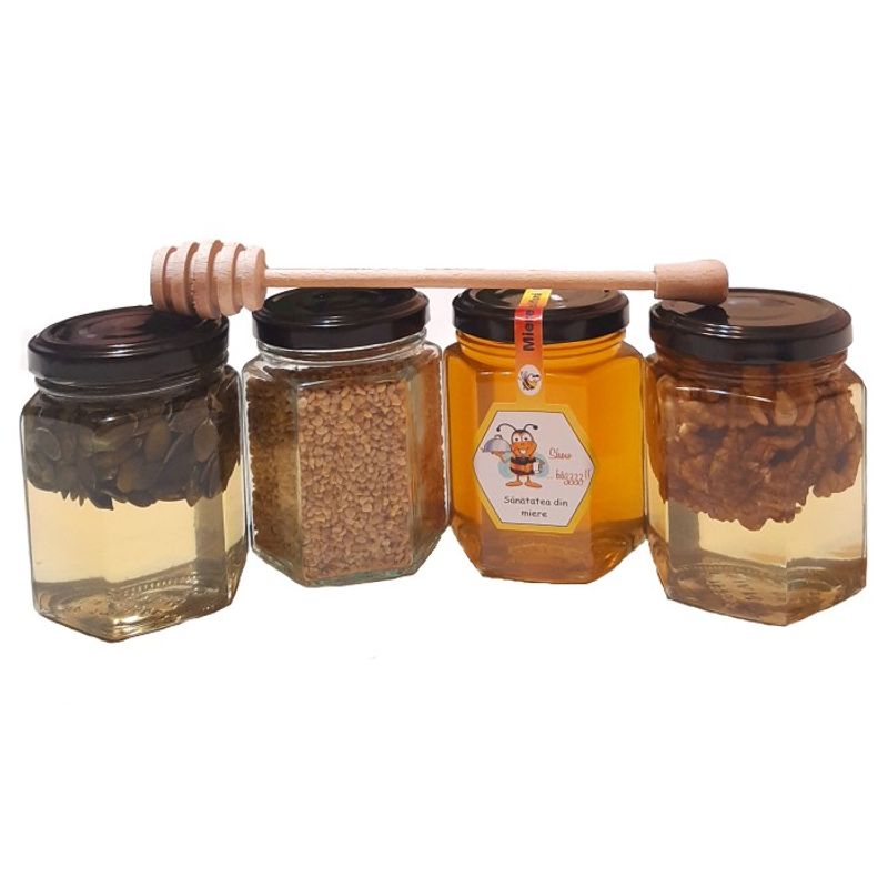 Set : 1 borcan miere cu nuca 250 g, 1 borcan miere cu seminte 250 g, 1 borcan polen 120 g, 1 borcan miere poliflora 250 g, Show Bazzz !!!