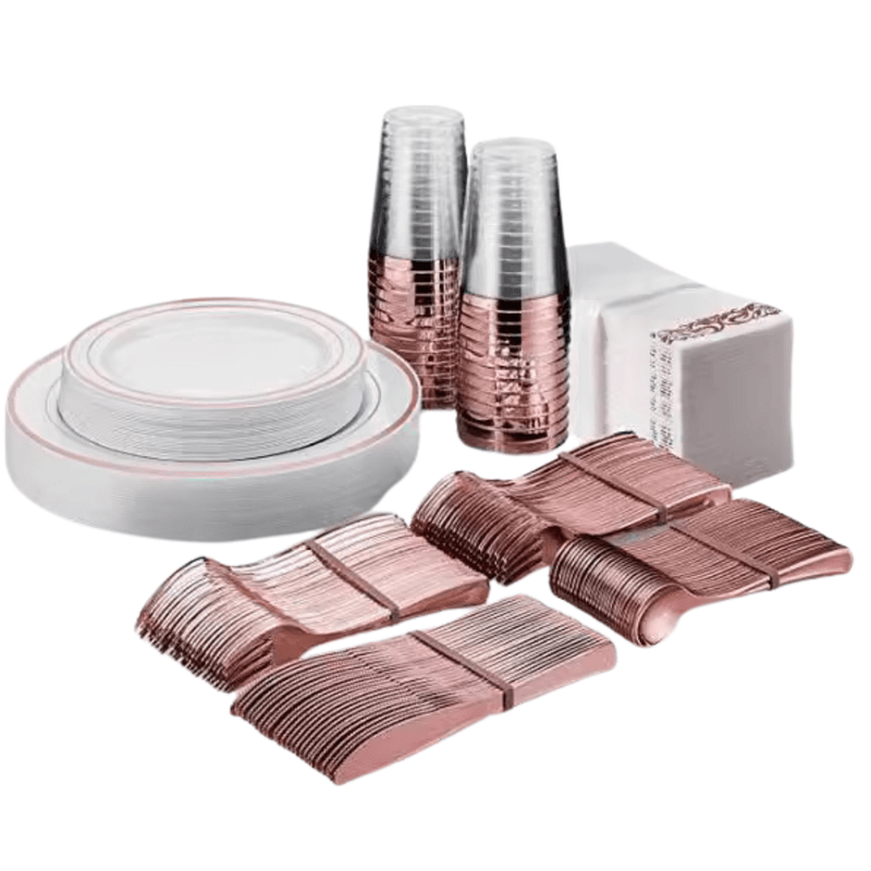 • Tacamuri Elegante din Plastic: Finisajul rose gold al tacamurilor ofera un aer sofisticat, perfect pentru intalniri formale, banchete si chiar mese zilnice sau picnicuri casual.