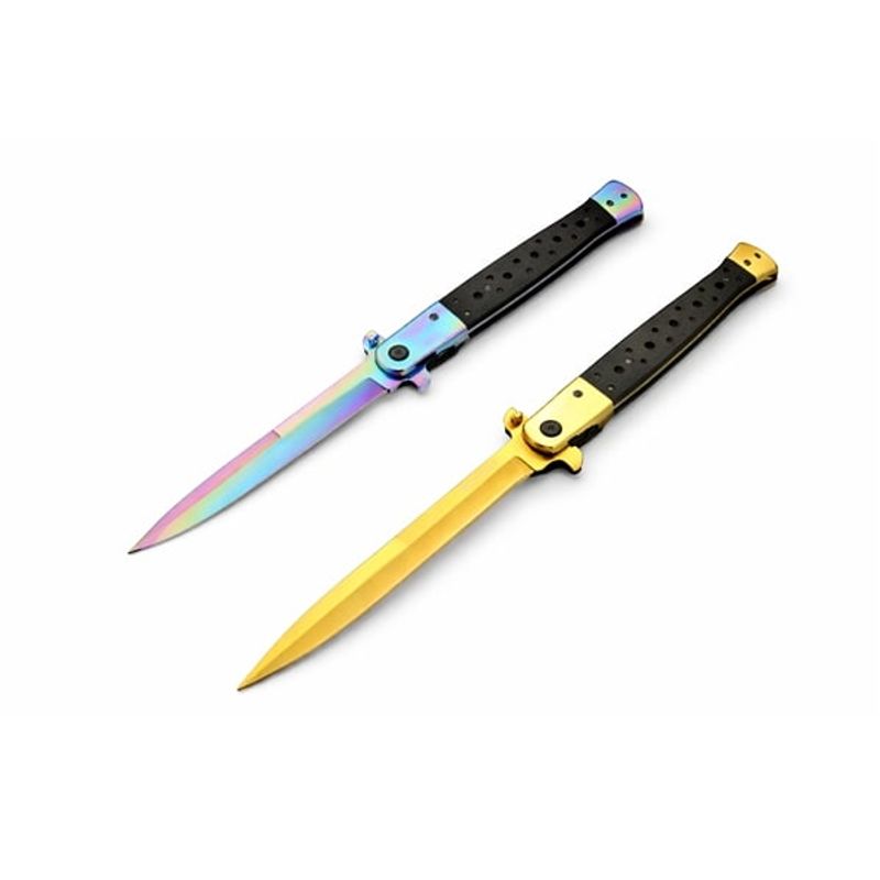 Setul conține două bricege Stiletto elegante, cu design clasic reinterpretat într-o formă modernă: unul cu finisaj auriu, celălalt cu lamă multicoloră (rainbow). Ambele sunt ideale pentru colecționari, pasionați de activități outdoor, camping sau ca piese de expunere.