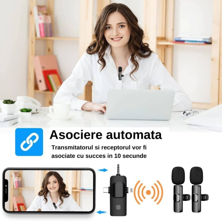 Set 2 microfoane profesionale lavaliera, Exaltus®, USB C, 3.5 Jack, Lightning, Wireless live, 2.4 GHz, interviuri Set 2 microfoane profesionale lavaliera, Exaltus®, USB C, 3.5 Jack, Lightning, Wireless live, 2.4 GHz, interviuri