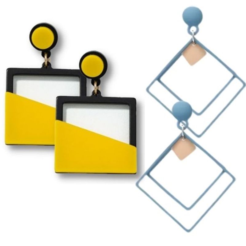Prima pereche include cercei patrati galbeni cu negru, lungime 6 cm, cu forme clare si impact vizual puternic. A doua pereche este formata din cercei albastru cu auriu, cu elemente geometrice rafinate si finisaje de inspiratie artistica.