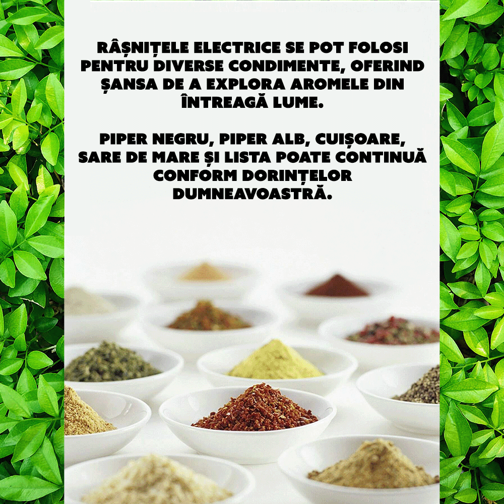 • Versatilitate pentru diferite condimente: Cele doua rasnite pot fi folosite pentru o varietate de condimente precum piper alb, piper negru, sare de mare, cuisoare, si altele, oferind versatilitate in bucatarie si facilitand prepararea diverselor retete.