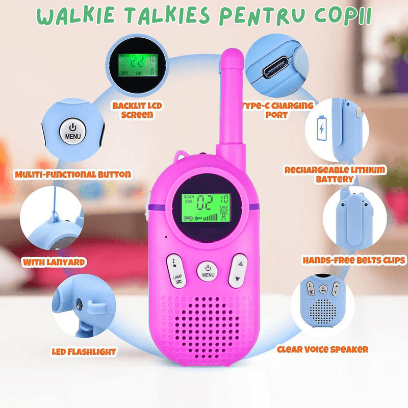 **【Cadou perfect pentru copii】:** Cauti un cadou grozav pentru copiii tai? Acest walkie talkie este o alegere perfecta pentru activitati interioare si exterioare pentru a promova interactiunea in familie sau in echipa si abilitatile de comunicare. Surprinde-ti copiii cu aceste walkie talkie-uri pentru cadouri de ziua de nastere, cadouri de Craciun si cadouri de sarbatori!