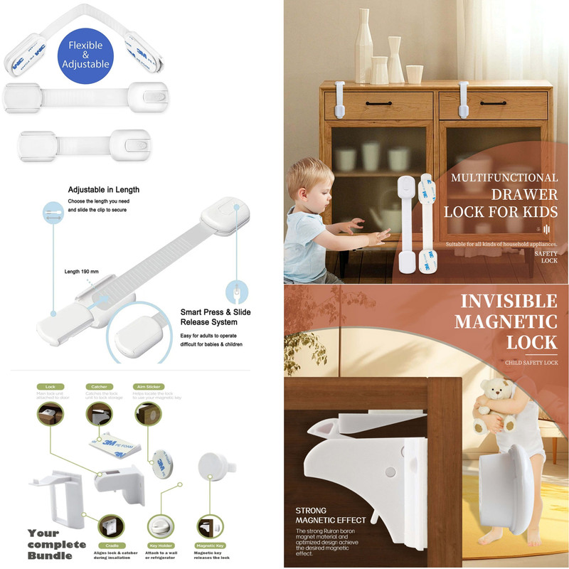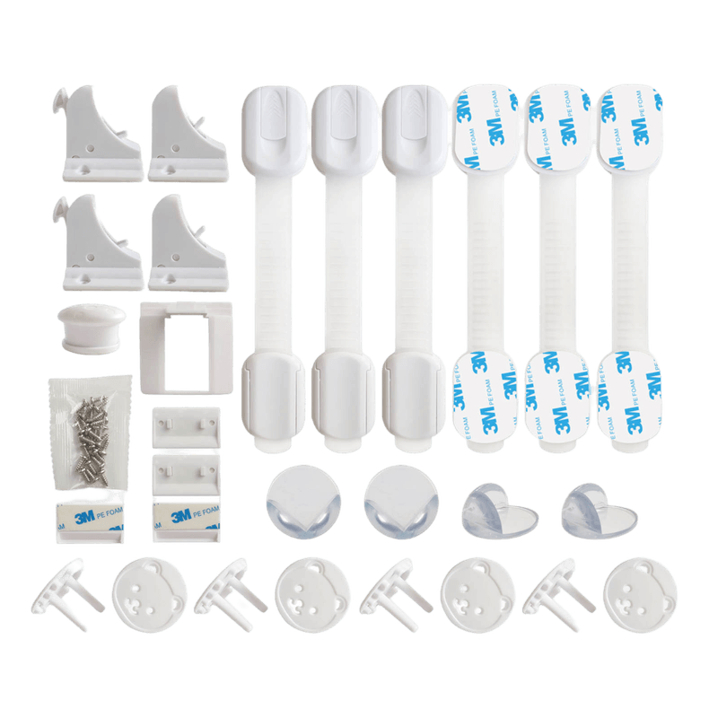 Setul de siguranta pentru bebelusi/copii LUVLU™ contine 22 de piese esentiale pentru a asigura un mediu sigur in casa. Acest set include 6 blocatoare flexibile si ajustabile, ideale pentru sertare, dulapuri, frigider, usi de cuptor si alte obiecte periculoase pe care vreti sa le tineti departe de mainile curioase ale copiilor. De asemenea, veti gasi 4 incuietori magnetice invizibile care ofera o siguranta suplimentara pentru dulapuri, sertare, usi etc.