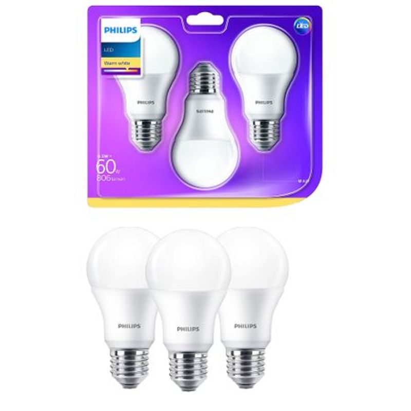 Set 3 becuri LED Philips, E27, 8W (60W), 806 lm, A+, lumina calda Set 3 becuri LED Philips, E27, 8W (60W), 806 lm, A+, lumina calda