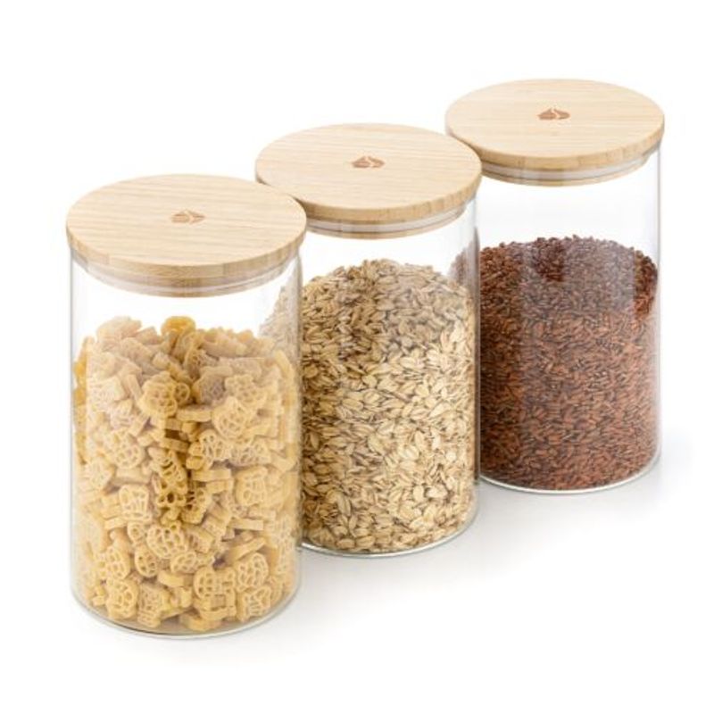 Depozitati mancarea in stil cu setul de borcane din sticla Navaris. Cu un design stivuitor si capace din bambus, utilizati recipientele pentru a depozita produse uscate, cum ar fi cafea, ceai, zahar, paste, cereale si multe altele. Capacele din lemn ale acestor recipiente de depozitare au etansare pentru a pastra alimentele proaspete pentru mai mult timp.
