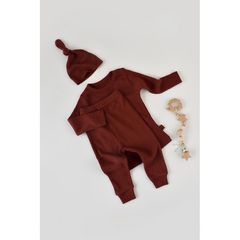 Set 3 piese: bluzita cu maneca lunga, pantaloni lungi si caciulita din bumbac organic si modal - Caramiziu BabyCosy (Marime: 18- Set 3 piese: bluzita cu maneca lunga, pantaloni lungi si caciulita din bumbac organic si modal - Caramiziu BabyCosy (Marime: 18-