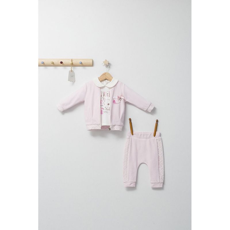 Set compus din 3 piese: pantaloni, bluzita si hainuta cu gluga eleganta pentru bebelusi din colectia Gazelle reprezinta o combinație de design spectaculos și confort absolut.