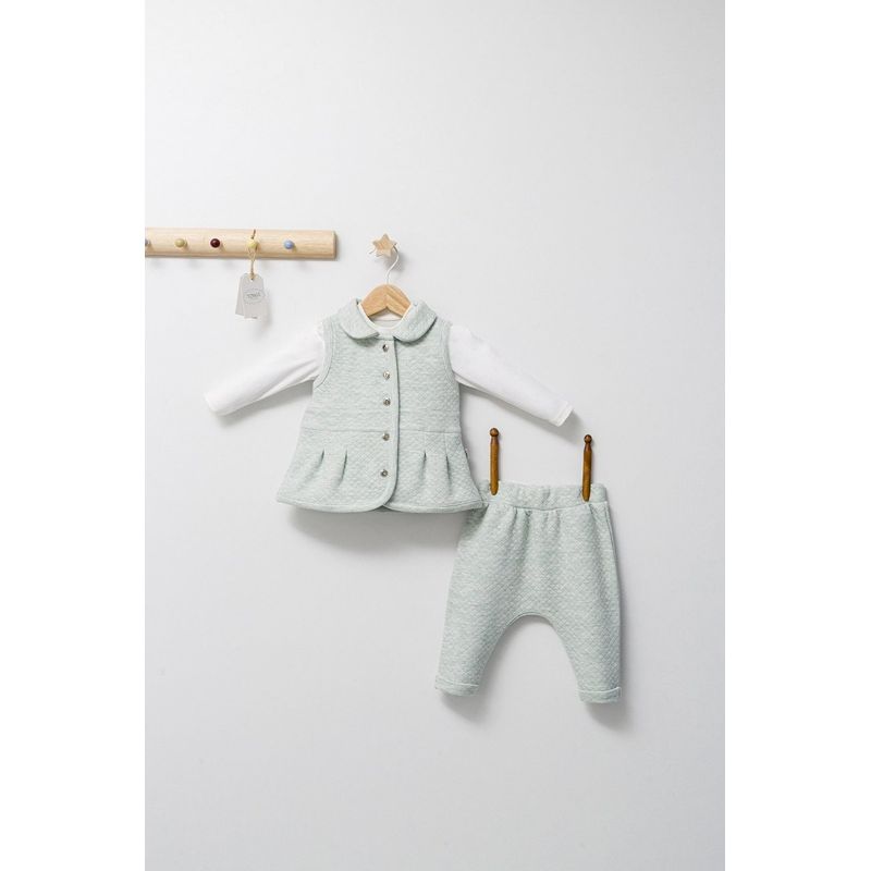 Set compus din 3 piese: pantaloni, bluzita si vestuta eleganta pentru bebelusi reprezinta o combinație de design spectaculos și confort absolut.