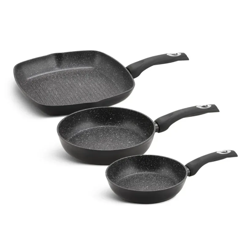 Cea mai recenta serie de tigai din acest set au un strat antiaderent de marmura. Invelisul antiaderent cu 3 straturi, gros, ultra-rezistent si durabil, este de foarte inalta calitate si 100% sigur (fara PFOA=nu sunt fabricate din substante care pot periclita sanatatea dvs.). Datorita stratului avansat cu efect de marmura, tigaile dvs.Edenberg nu se vor lipi de alimentele preparate. Ele sunt, de asemenea, super rapid de curatat. Acoperirea antiaderenta este atat de eficienta incat nu trebuie sa folositi ulei sau unt, astfel incat sa puteti pune pe masa alimente mai sanatoase. Stratul de invelis este rezistent la zgarieturi si extrem de durabil. In plus, invelisul ofera o conductivitate mai buna, rezultand un fel de mancare gatit perfect uniform. Tigaile sunt potrivite pentru surse de caldura cu gaz, inductie, electrice si ceramice. Acest set de tigai poate constitui cadoul ideal pentru o persoana draga Culoare neagra Setul contine 2 tigai rotunde cu diametrul de 20cm si 24cm si o tigaie tip grill de 28cm