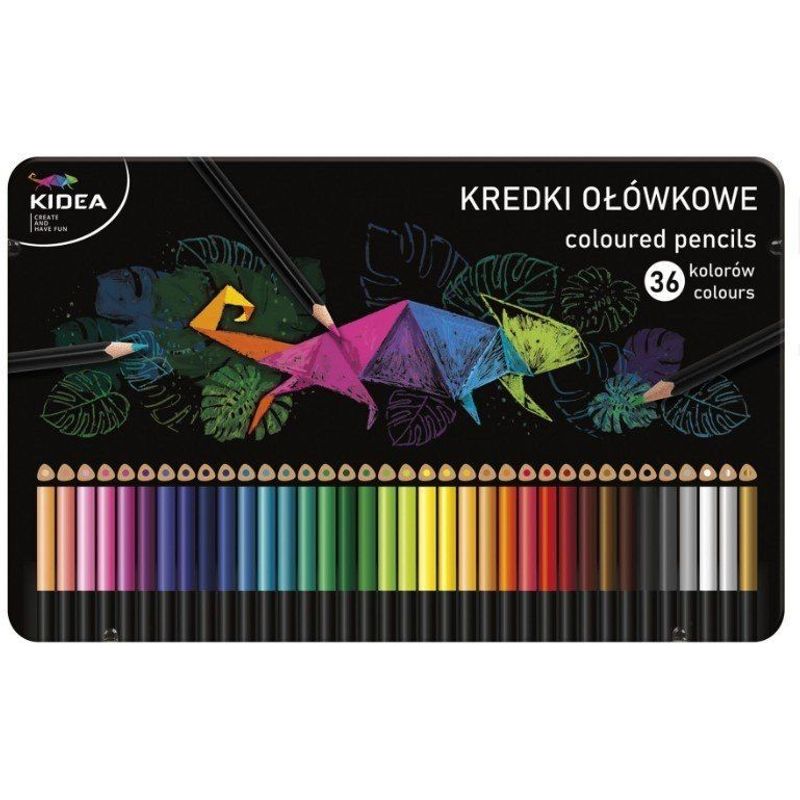 Set 36 creioane triunghiulare frumoase pentru copii, cutie metal, Kidea, multicolore Set 36 creioane triunghiulare frumoase pentru copii, cutie metal, Kidea, multicolore
