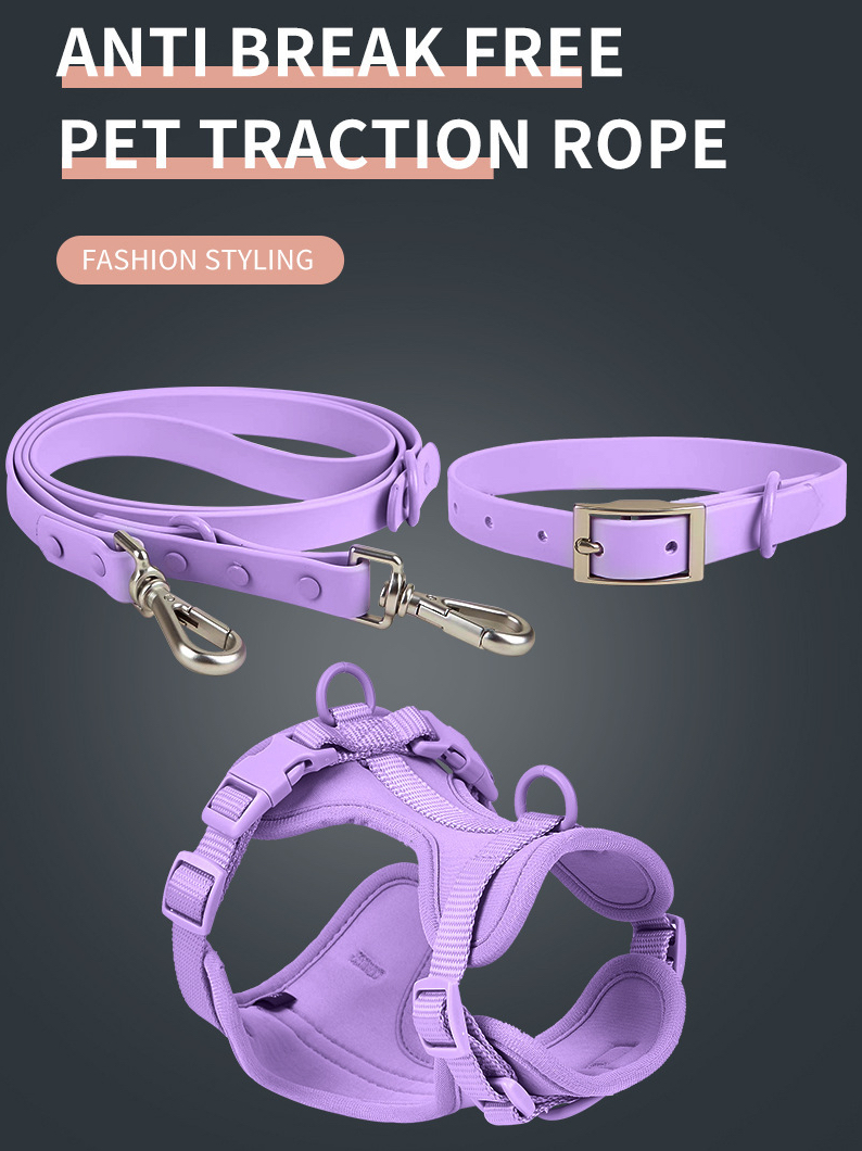Set 4 piese: zgarda, lesa, ham si dispenser pungi, rezistente la apa si murdarie, calitate premium, Lila Set 4 piese: zgarda, lesa, ham si dispenser pungi, rezistente la apa si murdarie, calitate premium, Lila, XS