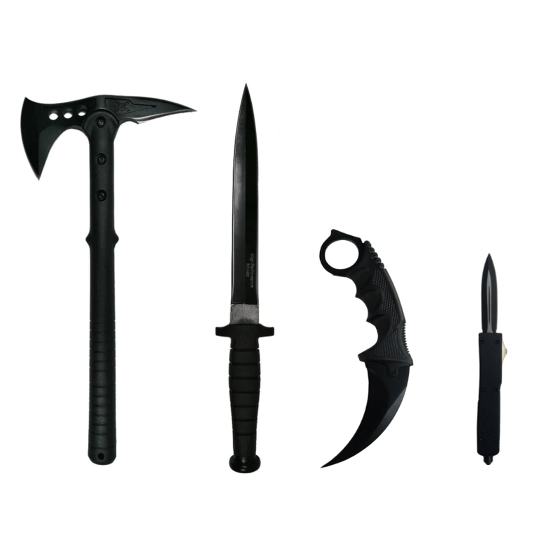 Set 4 ustensile DeltaForce, topor si 3 cutite, otel inoxidabil, negru Set 4 ustensile DeltaForce, topor si 3 cutite, otel inoxidabil, negru