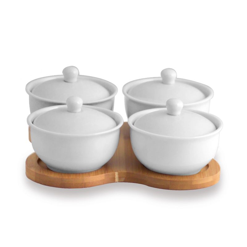 Set 5 piese servire, boluri portelan cu suport bambus Set 5 piese servire, boluri portelan cu suport bambus