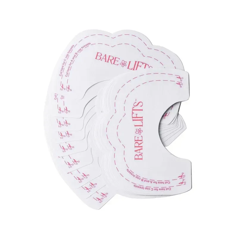 Fie ca mergeti la un eveniment important sau in club, plasturii Bare Lifts va ajuta sa aveti un decolteu de invidiat, bine pus la punct. Au un efect de push-up, ridicand si sustinand sanii si facandu-I mai proeminenti. Plasturii pot fi folositi cu sau fara sutien. Potriviti pentru marimea A,B,C,D, reglabili: in prealabil se decupeaza eticheta pe linia punctata, in functie de dimensiunea cupelor folosite: linia de interior pentru cupele A si B, linia exterioara pentru C, iar pentru D nu se decupeaza deloc. Aplicarea si scoaterea plasturilor este foarte usoara si simpla, se folosesc doar pentru uz extern. Mod de folosire: Pasul 1 - se indeparteaza protectia de pe partea inferioara a benzii autoadezive si se fixeaza chiar deasupra mamelonului, Pasul 2 - se scoate protectia de pe partea superioara a benzii autoadezive, urmand a se aplica pe piele dupa o ridicare prealabila a sanului, Pasul 3 - pieptul este sustinut datorita benzii autoadezive aplicate. Este recomandata pastrarea plasturilor intr-un loc uscat, aerat, ferit de lumina. Nu este recomandata folosirea plasturelui/sticker-ului Bare Lift's pe pielea deteriorata, inflamata, infectata sau cu plaga deschisa. Nu este recomandata purtarea lui peste noapte. Dupa o utilizare se arunca. Pachetul contine: 50 buc.(25 seturi) Plasturi Bare Lifts, in cutie de prezentare