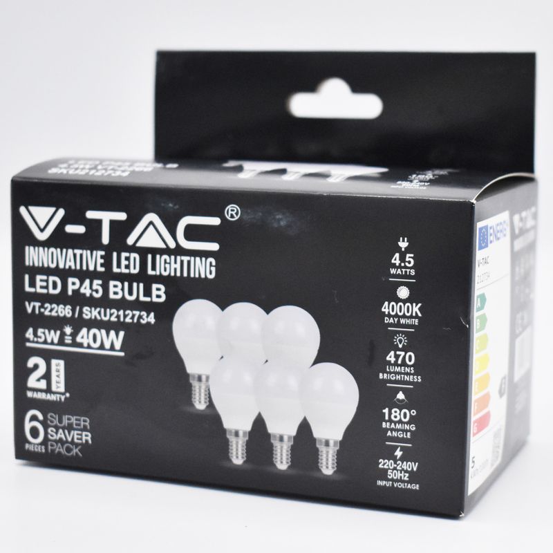 Set 6 becuri LED sferice 4.5W (40W), E14, P45, 470 lm, lumina neutra (4000K), opal, V-TAC Set 6 becuri LED sferice 4.5W (40W), E14, P45, 470 lm, lumina neutra (4000K), opal, V-TAC