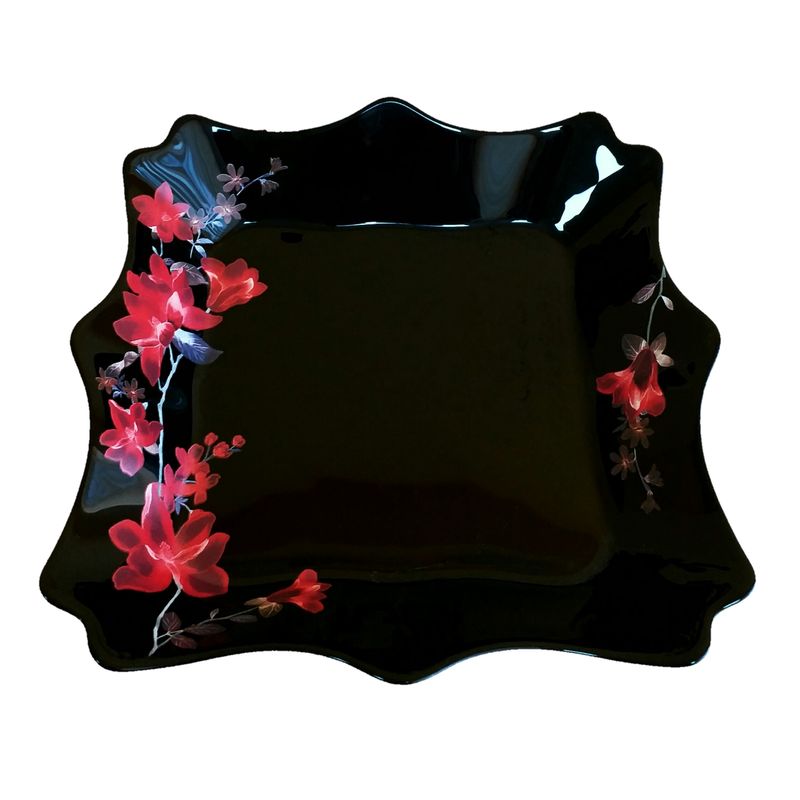 Set 6 farfurii, negre cu flori rosii, opal, adanci, patrate, adanci, 20cm Set 6 farfurii, negre cu flori rosii, opal, adanci, patrate, adanci, 20cm