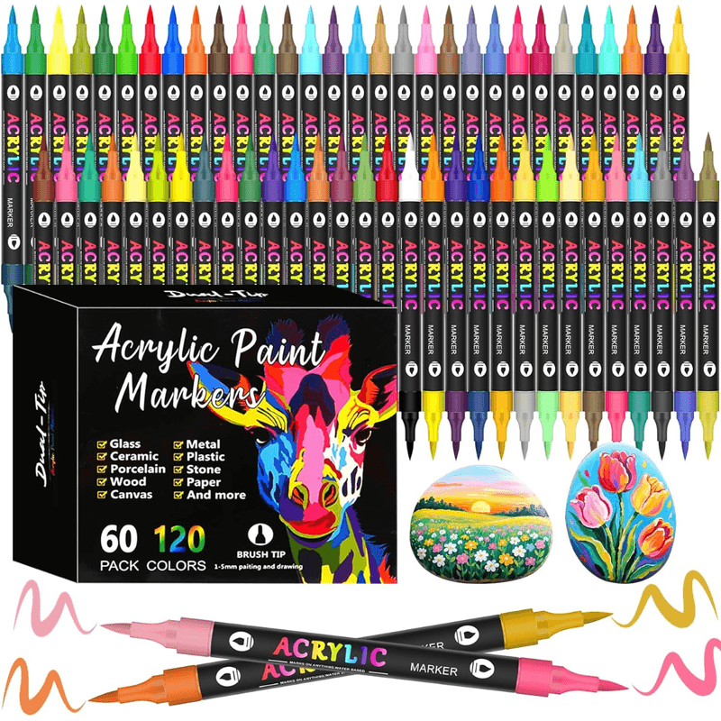 Set 60 carioci profesionale Acrilice cu Varf dublu, 120 Culori cu cerneala pe baza de apa, multicolore pentru desen Set 60 carioci profesionale Acrilice cu Varf dublu, 120 Culori cu cerneala pe baza de apa, multicolore pentru desen