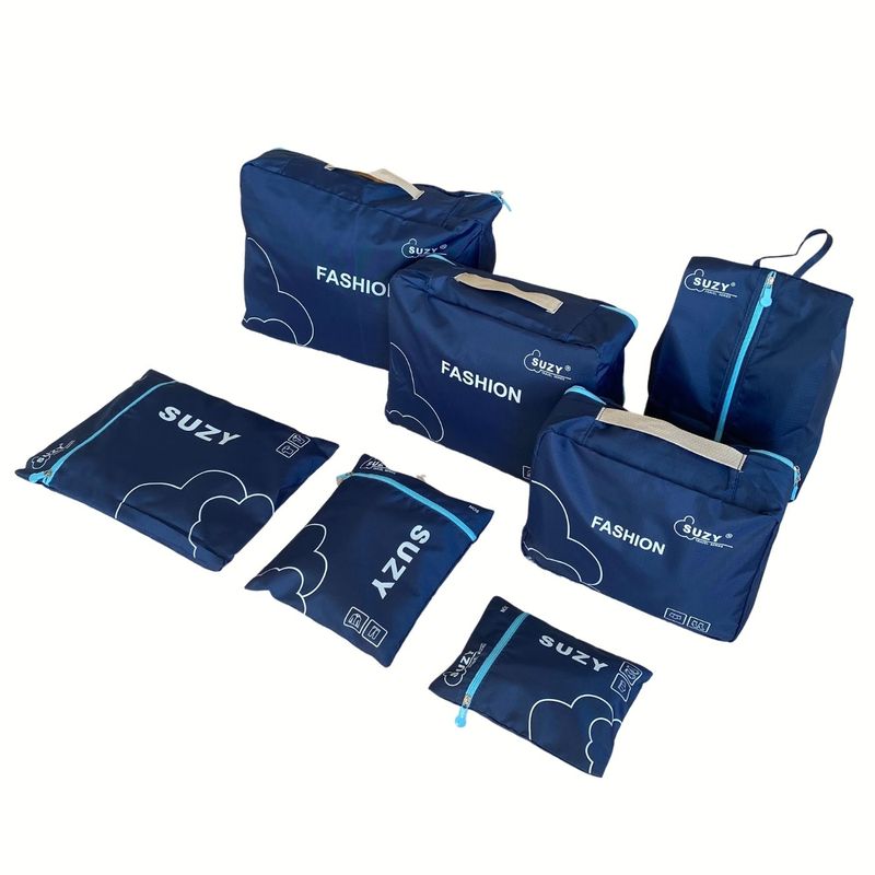 Set 7 huse organizare bagaj pentru calatorie, 3x plicuri impermeabile, 3x huse plasa, 1x organizator pantofi, Albastru Set 7 huse organizare bagaj pentru calatorie, 3x plicuri impermeabile, 3x huse plasa, 1x organizator pantofi, Albastru