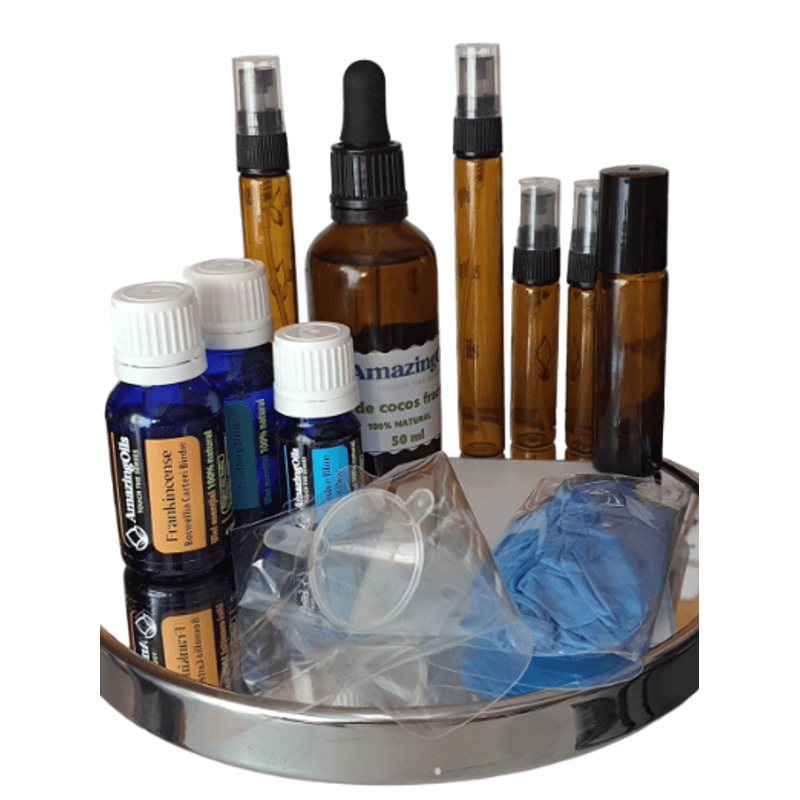 Set pentru iubitorii aromaterapiei care cuprinde uleiuri,sticlute si roll-on pentru mixarea uleiurilor esentiale cu ulei de dilutie.