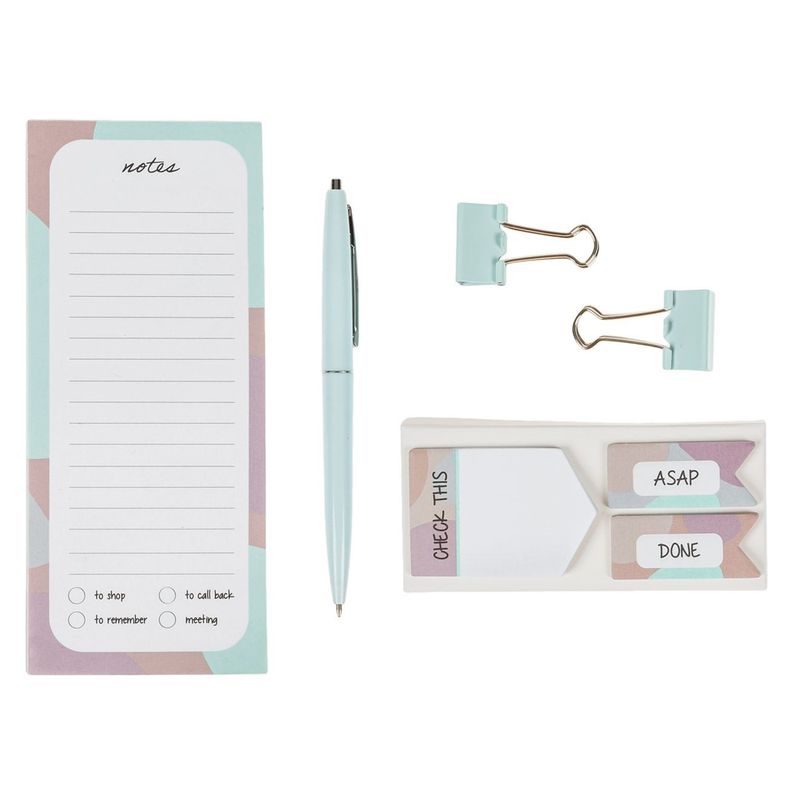Set birou 7 piese, culori pastelate, note, agrafe, pix, notite autocolante, semne carte Set birou 7 piese, culori pastelate, note, agrafe, pix, notite autocolante, semne carte