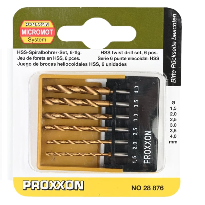 Casa si GradinaConstructiiScule electrice si accesoriiSeturi si accesorii pentru gaurit si insurubatSet burghie HSS pentru lemn si plastic cu pin pentru centrare Proxxon 28876, Ø1.5-Ø4 mm, 6 piese