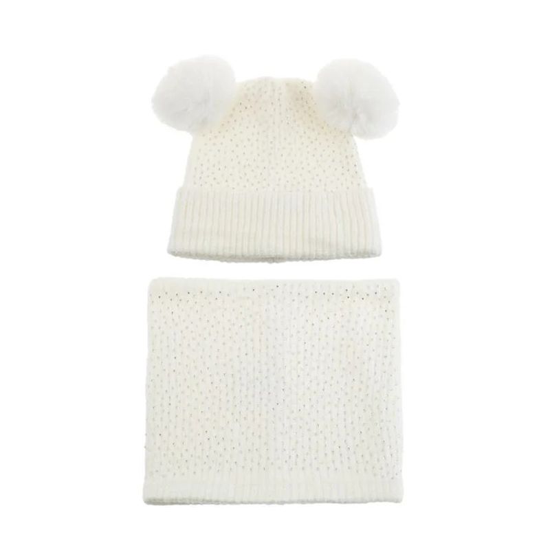 Set Caciula cu Strasuri, Urechi Pompon si Fular, captuseala fleece, 6 ani, ecru Set Caciula cu Strasuri, Urechi Pompon si Fular, captuseala fleece, 6 ani, ecru