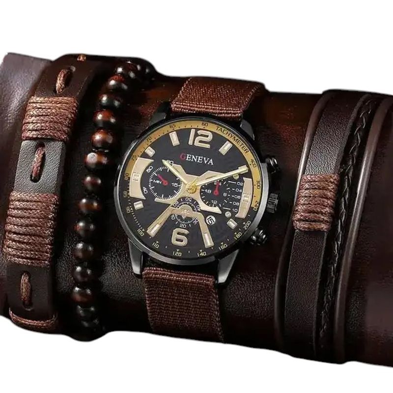 Cumpara acum si bucura-te de: Ambalaj elegant, gata de a fi daruit Garantie pentru ceas si bratari Caracteristici ceas: Gen: Masculin Stil: Elegant Mecanism: Quartz Producator: Geneva Material Carcasa: Metal Diametru Carcasa: 4 cm Latime Carcasa: 0.8 cm Material Curea: Piele ecologica Lungime Curea: 24 cm Latime Curea: 2 cm Material Geam: Sticla Functii: Data, O ra, minut, secunda Culoare cadran: Negru/Auriu Culoare curea: Maro Inchidere curea: Pin Afisaj: Analog Rezistent la apa: Folosire zilnica obisnuita.