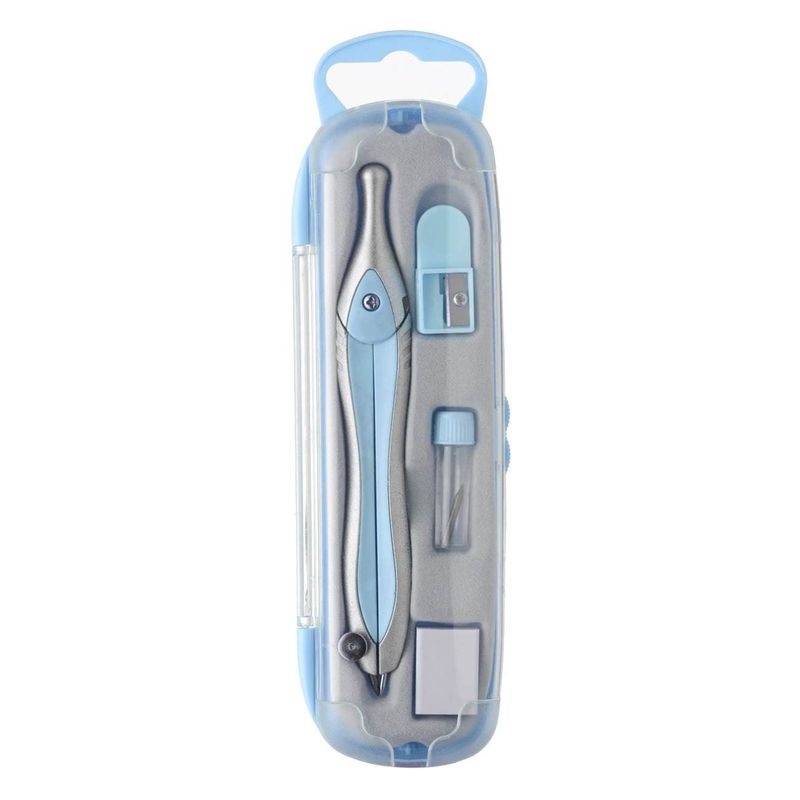Set compas geometrie, metalic argintiu bleu, radiera, varf de rezerva, ascutitoare, 4 bucati Set compas geometrie, metalic argintiu bleu, radiera, varf de rezerva, ascutitoare, 4 bucati