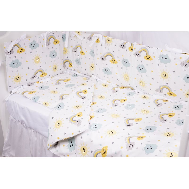Lenjeria model curcubee si norisori este realizata din bumbac 100%, moale, dens si foarte placut la atingere, certificat si sigur pentru copii inca de la nastere. Lenjeria contine 7 piese, astfel ca setul va avea: - husa pilota 80x100 cm - pilota detasabila 80x100 cm - husa de pernuta 40x50 cm - pernuta plata 40x50 cm - cearsaf cu elastic pentru salteluta de 120x60x10 cm - 2 aparatori pentru patut cu dimensiunea de 180x33x2 cm fiecare Aparatorile sunt in varianta groasa. Cu 2 cm grosime si o inaltime de 33 cm, aparatorile protejeaza bebelusul si il tin in siguranta pe timpul noptii sau atunci cand ramane in patut. Sireturile aparatorii sunt confectionate din bumbac in 4 straturi, fiind rezistente la prinderi pentru timp indelungat. Pilota are 2 cm grosime, fiind potrivita pentru interior inclusiv in sezonul rece. Este detasabila si usor de folosit, curatat si refolosit pentru multa vreme. Ne-am asigurat ca este bine cusuta si finisata, astfel ca interiorul nu i se va strange, pastrandu-si forma si dupa cativa ani. Pernuta plata este foarte subtire, nu modifica postura bebelusului in timpul somnului. Cearsaful este realizat pe dimensiunea saltelutei patutului. Dispune de elastice pe rezistente si foarte practice. Se potriveste saltelutelor de pana la 10 cm inaltime. Imprimeul cu curcubee si norisori este unul colorat si vesel, potrivit copiilor de la nastere si pana la varsta de aproximativ 3 anisori. Alege acest set complet pentru copilasul tau sau pentru a-l oferi in dar unui copilas drag, cu ocazia unui bayshower, botez sau aniversare. Compozitie: bumbac 100% , vatelina siliconizata Dimensiuni: vezi descriere produs Instructiuni intretinere: spalare la 40 grade C, 800 rpm, uscare la aer. Produsele se calca la temperaturi adecvate bumbacului. Fabricat in Romania.