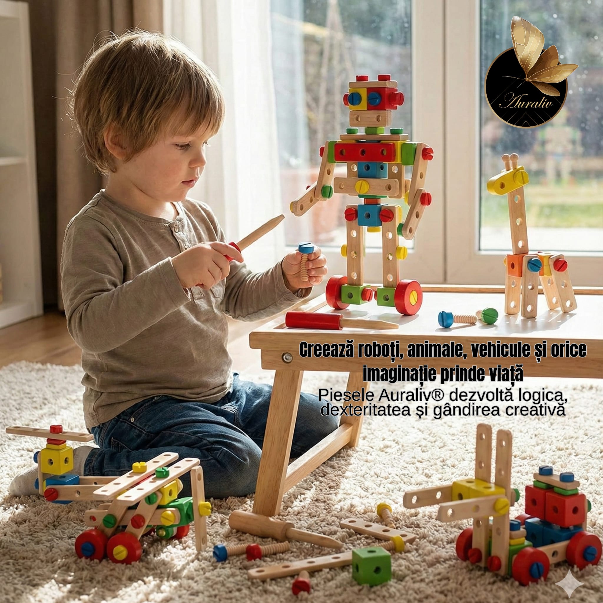 Setul de constructie din lemn Auraliv® – 73 Piese este o jucarie educativa inspirata din metoda Montessori, conceputa pentru a stimula creativitatea, logica, coordonarea mana–ochi si motricitatea fina a copiilor.