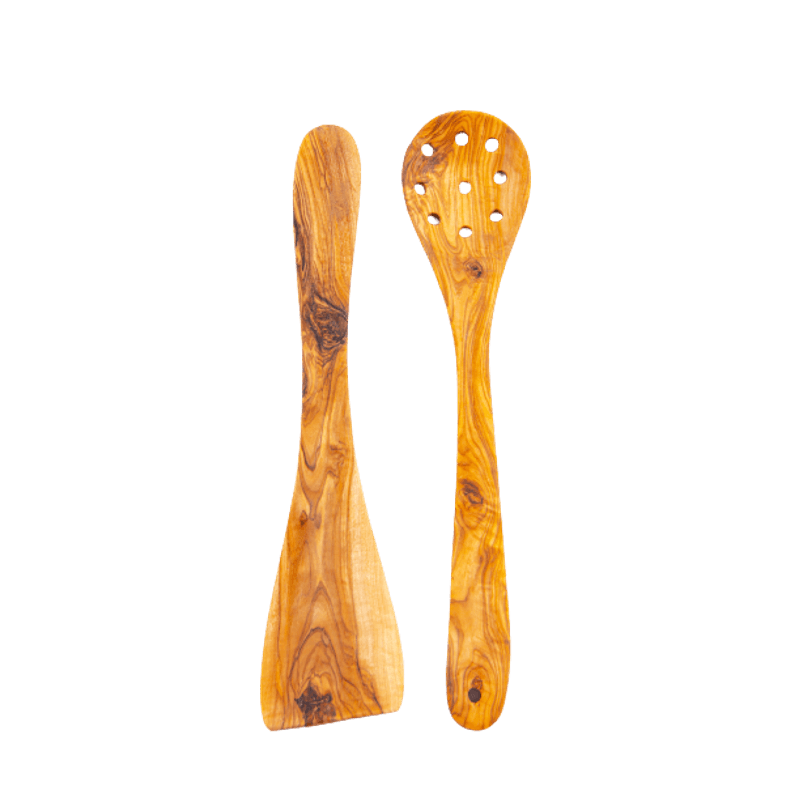 Set Corsica 2 ustensile spatula si lingura cu gauri din lemn de maslin 30 cm Set Corsica 2 ustensile spatula si lingura cu gauri din lemn de maslin 30 cm