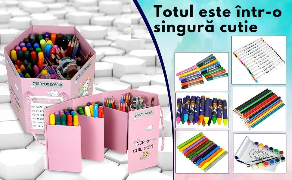 - Set complet de 93 de piese: Include creioane colorate, carioci lavabile, markere permanente, acuarele, creioane cerate, pensule si un caiet de desen.