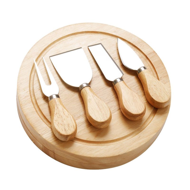 Set cu 4 cutite pentru branza cu suport, tocator si manere din lemn, lame din otel, maro deschis