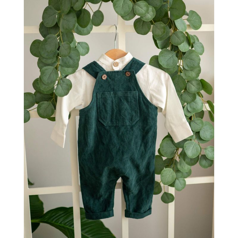 Set cu salopeta de catifea verde si camasa din in 80 cm 9-12 luni Set cu salopeta de catifea verde si camasa din in 80 cm 9-12 luni