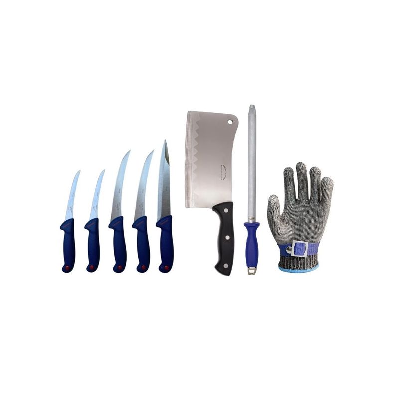 Set cutite profesionale macelarie, 8 piese, injunghiat, transat, dezosat si degresat, masat pentru ascutit, manusa anti taiere, otel inoxidabil, albastru.