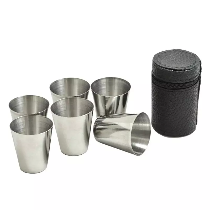 Set de 6 pahare de 30 ml, otel inoxidabil cu husa din piele ecologica, Gonga® Argintiu Set de 6 pahare de 30 ml, otel inoxidabil cu husa din piele ecologica, Gonga® Argintiu
