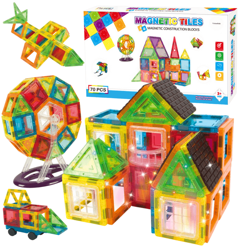 Set de Constructie, Magnetic Tiles 3D, 70 Piese colorate, Jucarie Creativa si Educationala STEM VisionHub®, multiple forme de constructie, Dezvoltarea Abilitatilor Motrice si a Imaginatiei, Multicolor.