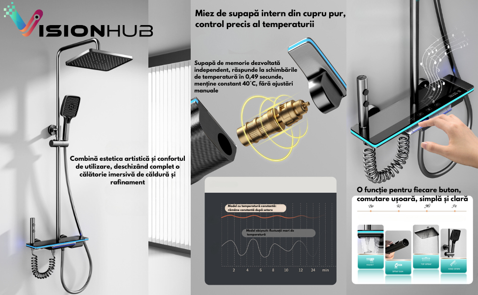 Cu un design inspirat de clapele unui pian, acest sistem va permite sa comutati cu o singura apasare intre capul de dus, dusul de mana, bidet si robinetul pentru cada. Functiile sunt clar marcate, asigurand o experienta de baie confortabila si rapida.
