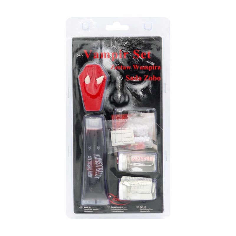 Set de machiaj Vampir pentru Halloween cu lentile de contact, dinti falsi si sange artificial Set de machiaj Vampir pentru Halloween cu lentile de contact, dinti falsi si sange artificial