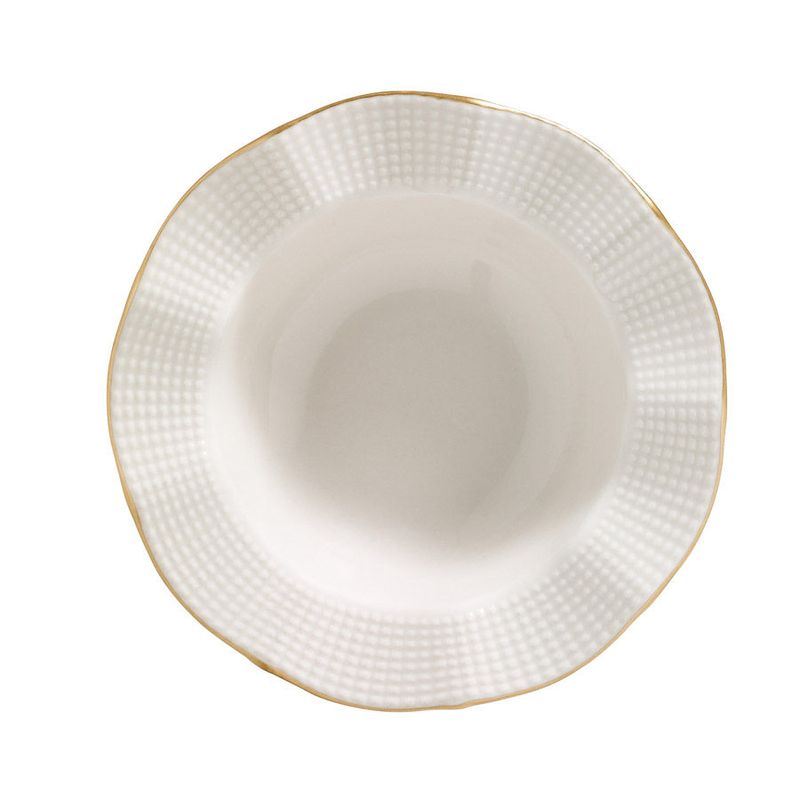 Cufundați-vă într-o lume a luxului în timp ce savurați mâncărurile preferate pe farfuriile noastre uimitoare de serviciu, farfurii, boluri și farfurii de desert. Culorile crem și auriu adaugă o notă de opulență mesei dvs., creând un fundal vizual uimitor pentru creațiile dvs. culinare.